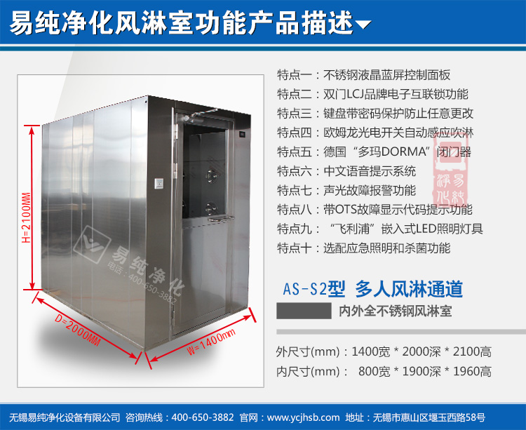 1. 外型尺寸(W*D*H):1400mm*2000mm*2100mm;風淋區尺寸(W*D*H):800mm*1900mm*1960mm